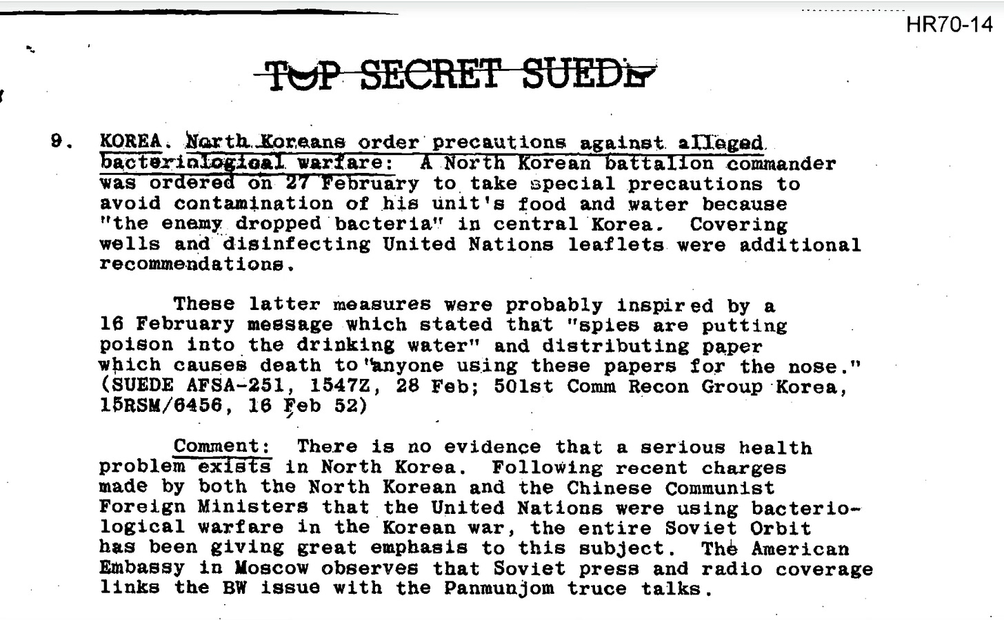 In the screenshot of one of the top secret CIA COMINT reports pictured above, section 9 of the report, dated 29 February 1952, is labelled, “KOREA. North Koreans order precautions against alleged bacteriological warfare.” (Italics are printed as underlined text in the original.)